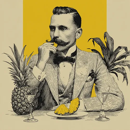 Prompt: T-SHIRT DESIGN. An upper class gentleman eating pineapple slices